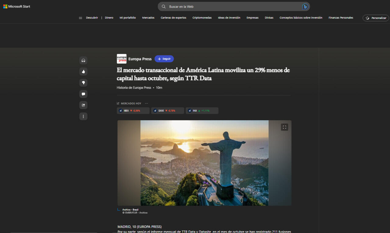 El mercado transaccional de América Latina moviliza un 29% menos de capital hasta octubre, según TTR Data