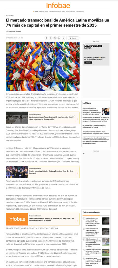 El mercado transaccional de América Latina moviliza un 7% más de capital en el primer semestre de 2025