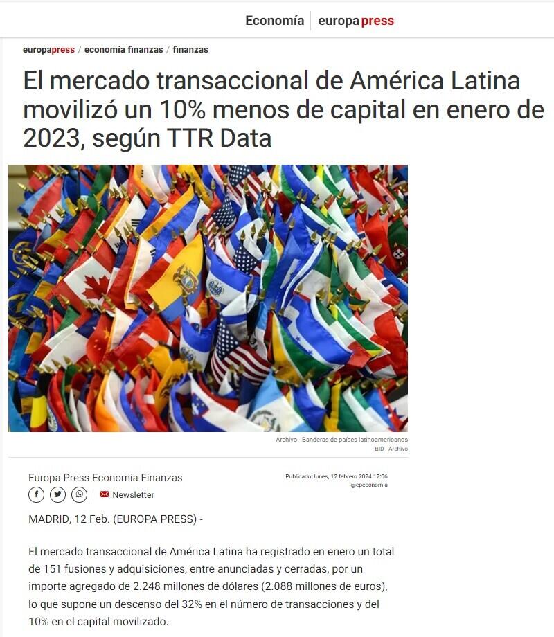El mercado transaccional de América Latina movilizó un 10% menos de capital en enero de 2023, según TTR Data