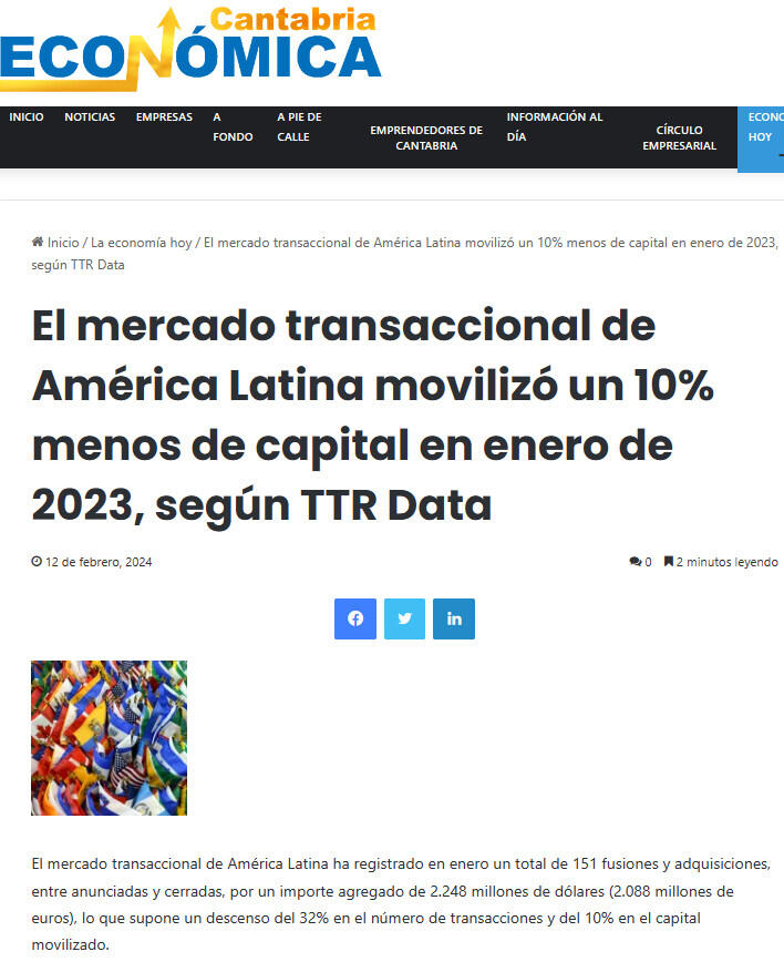 El mercado transaccional de América Latina movilizó un 10% menos de capital en enero de 2023, según TTR Data