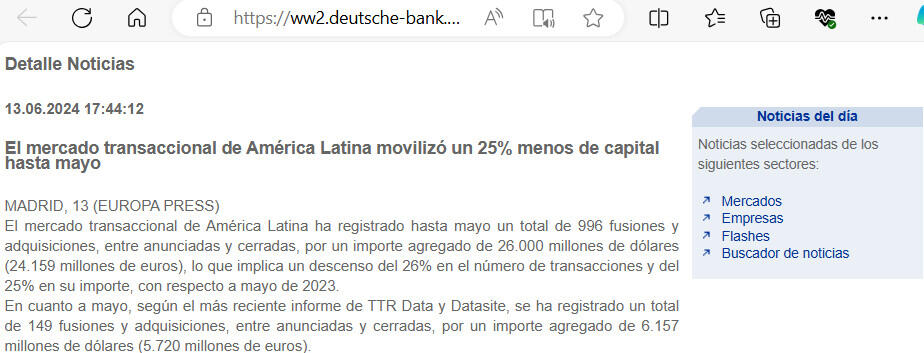 El mercado transaccional de América Latina ha registrado hasta mayo un total de 996 fusiones y adquisiciones, entre anunciadas y cerradas, por un importe agregado de 26.000 millones de dólares (24.159 millones de euros), lo que implica un descenso del 26% en el número de transacciones y del 25% en su importe, con respecto a mayo de 2023.