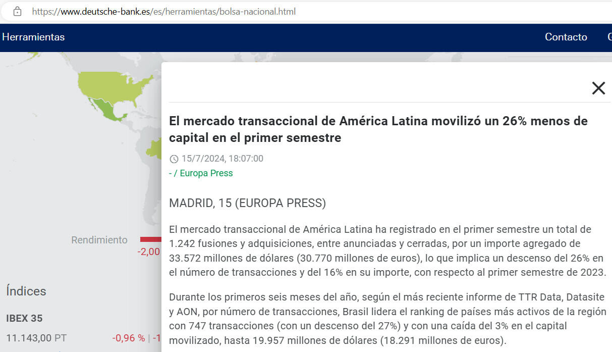 El mercado transaccional de América Latina ha registrado en el primer semestre un total de 1.242 fusiones y adquisiciones, entre anunciadas y cerradas, por un importe agregado de 33.572 millones de dólares (30.770 millones de euros), lo que implica un descenso del 26% en el número de transacciones y del 16% en su importe, con respecto al primer semestre de 2023.