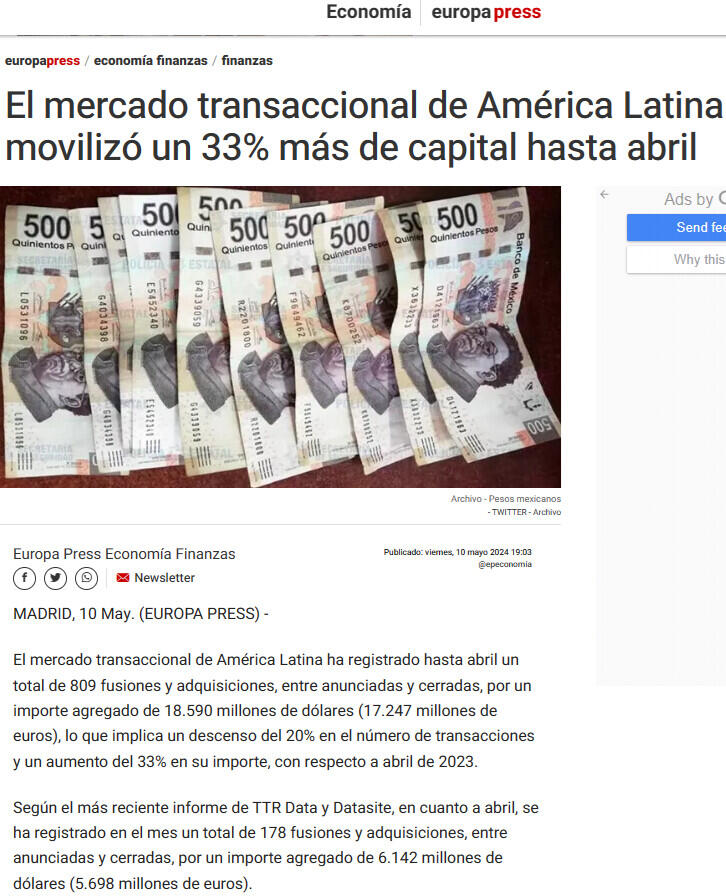 El mercado transaccional de América Latina ha registrado hasta abril un total de 809 fusiones y adquisiciones, entre anunciadas y cerradas, por un importe agregado de 18.590 millones de dólares (17.247 millones de euros), lo que implica un descenso del 20% en el número de transacciones y un aumento del 33% en su importe, con respecto a abril de 2023.