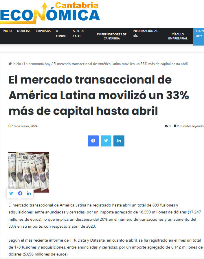 El mercado transaccional de América Latina ha registrado hasta abril un total de 809 fusiones y adquisiciones, entre anunciadas y cerradas, por un importe agregado de 18.590 millones de dólares (17.247 millones de euros), lo que implica un descenso del 20% en el número de transacciones y un aumento del 33% en su importe, con respecto a abril de 2023.
