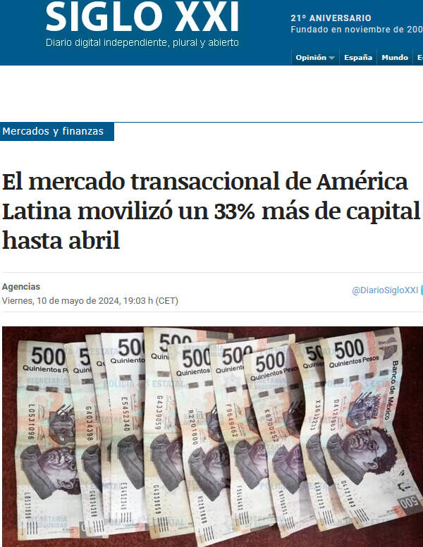 El mercado transaccional de América Latina ha registrado hasta abril un total de 809 fusiones y adquisiciones, entre anunciadas y cerradas, por un importe agregado de 18.590 millones de dólares (17.247 millones de euros), lo que implica un descenso del 20% en el número de transacciones y un aumento del 33% en su importe, con respecto a abril de 2023.