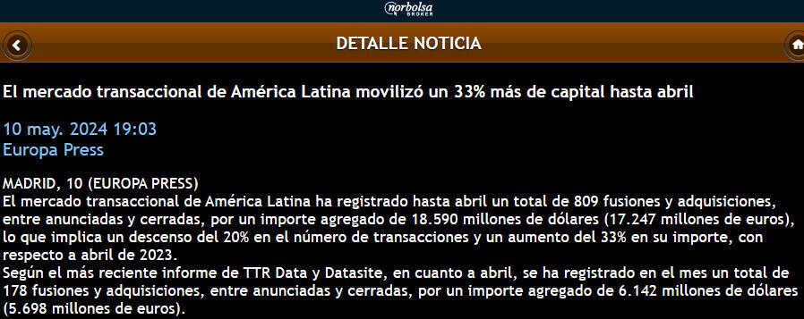El mercado transaccional de América Latina ha registrado hasta abril un total de 809 fusiones y adquisiciones, entre anunciadas y cerradas, por un importe agregado de 18.590 millones de dólares (17.247 millones de euros), lo que implica un descenso del 20% en el número de transacciones y un aumento del 33% en su importe, con respecto a abril de 2023.