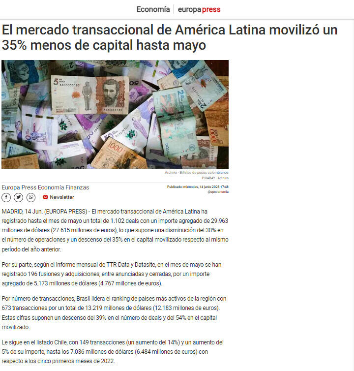 Por su parte, México permanece en la misma posición del ranking con 130 transacciones (una disminución del 27%) y con un aumento del 32% en el capital movilizado, llegando a los 9.353 millones de dólares (8.620 millones de euros). Colombia, mientras, registra 88 transacciones hasta mayo, lo que supone un 34% que en el mismo período de 2022, y se queda en los 2.286 millones de dólares (2.107 millones de euros) movilizados, lo que representa un 42% menos.