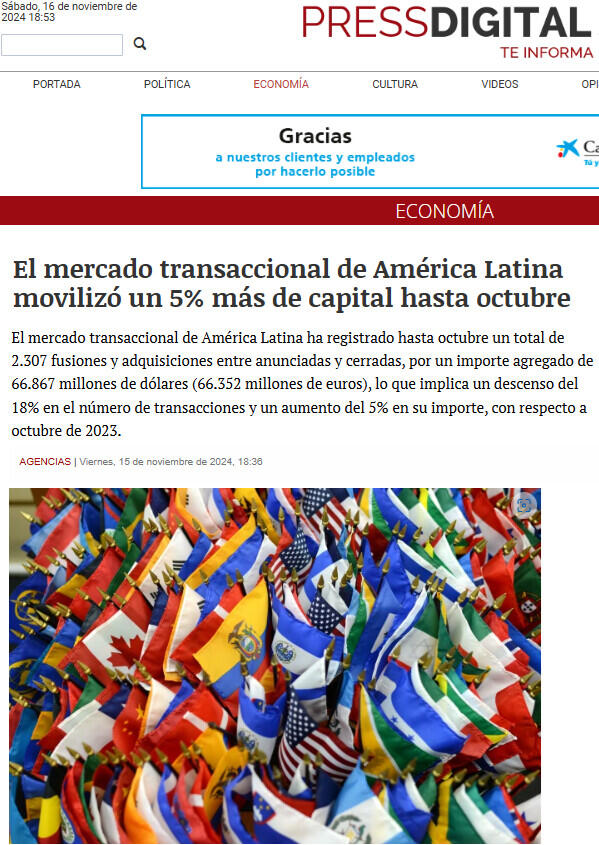 El mercado transaccional de América Latina ha registrado hasta octubre un total de 2.307 fusiones y adquisiciones entre anunciadas y cerradas, por un importe agregado de 66.867 millones de dólares (66.352 millones de euros), lo que implica un descenso del 18% en el número de transacciones y un aumento del 5% en su importe, con respecto a octubre de 2023.