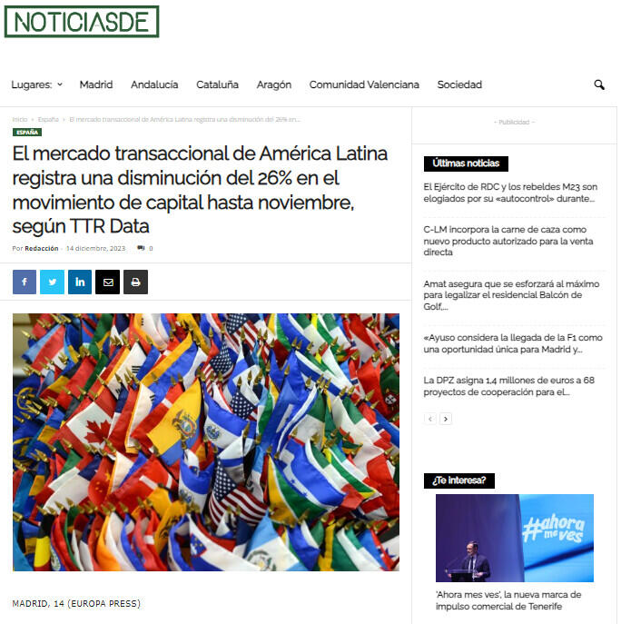 El mercado transaccional de América Latina registra una disminución del 26% en el movimiento de capital hasta noviembre, según TTR Data