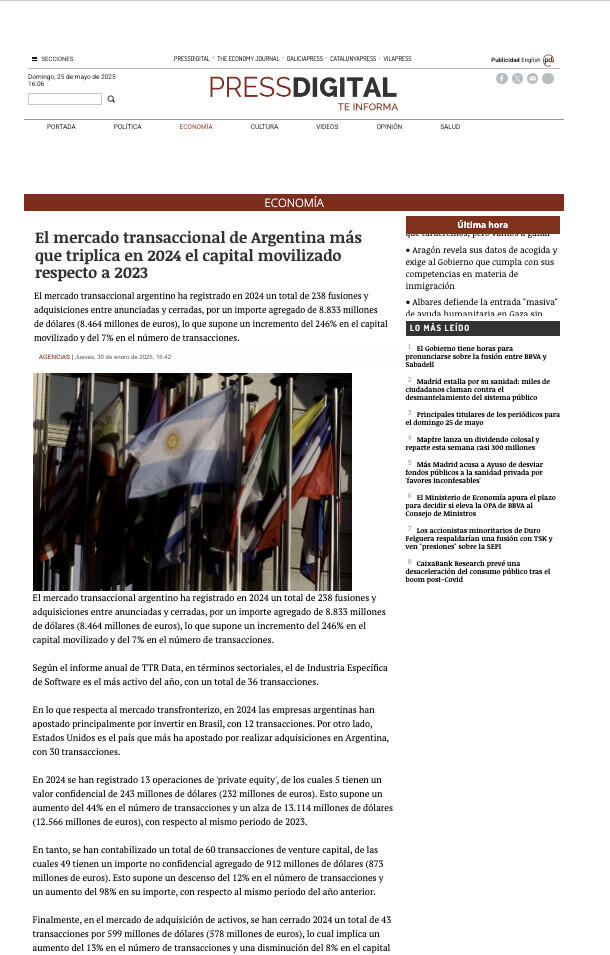 El mercado transaccional de Argentina más que triplica en 2024 el capital movilizado respecto a 2023