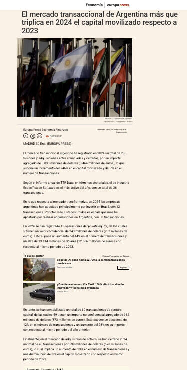 El mercado transaccional argentino ha registrado en 2024 un total de 238 fusiones y adquisiciones, entre anunciadas y cerradas, por un importe agregado de 8.653 millones de dólares (8.064 millones de euros), lo que supone un incremento del 246% en el capital movilizado y del 7% en el número de transacciones.