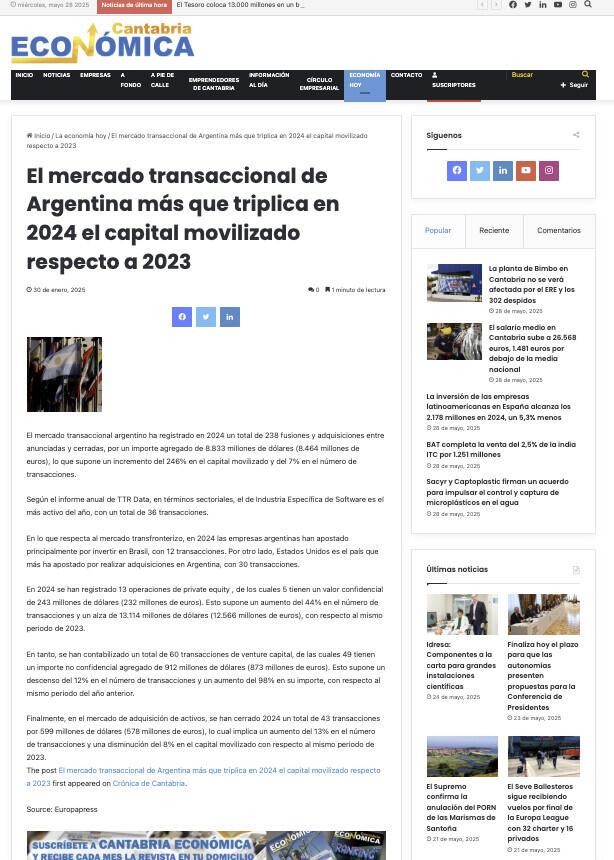 El mercado transaccional argentino registró en 2024 un total de 238 fusiones y adquisiciones, entre anunciadas y cerradas, con un importe agregado de 8.833 millones de dólares (8.464 millones de euros), lo que representa un incremento del 246% en capital movilizado y del 7% en número de operaciones con respecto a 2023.