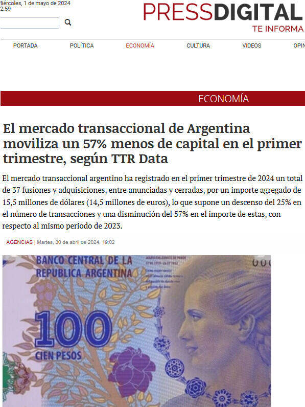 El mercado transaccional argentino ha registrado en el primer trimestre de 2024 un total de 37 fusiones y adquisiciones, entre anunciadas y cerradas, por un importe agregado de 15,5 millones de dólares (14,5 millones de euros), lo que supone un descenso del 25% en el número de transacciones y una disminución del 57% en el importe de estas, con respecto al mismo periodo de 2023.