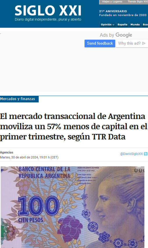 El mercado transaccional argentino ha registrado en el primer trimestre de 2024 un total de 37 fusiones y adquisiciones, entre anunciadas y cerradas, por un importe agregado de 15,5 millones de dólares (14,5 millones de euros), lo que supone un descenso del 25% en el número de transacciones y una disminución del 57% en el importe de estas, con respecto al mismo periodo de 2023.