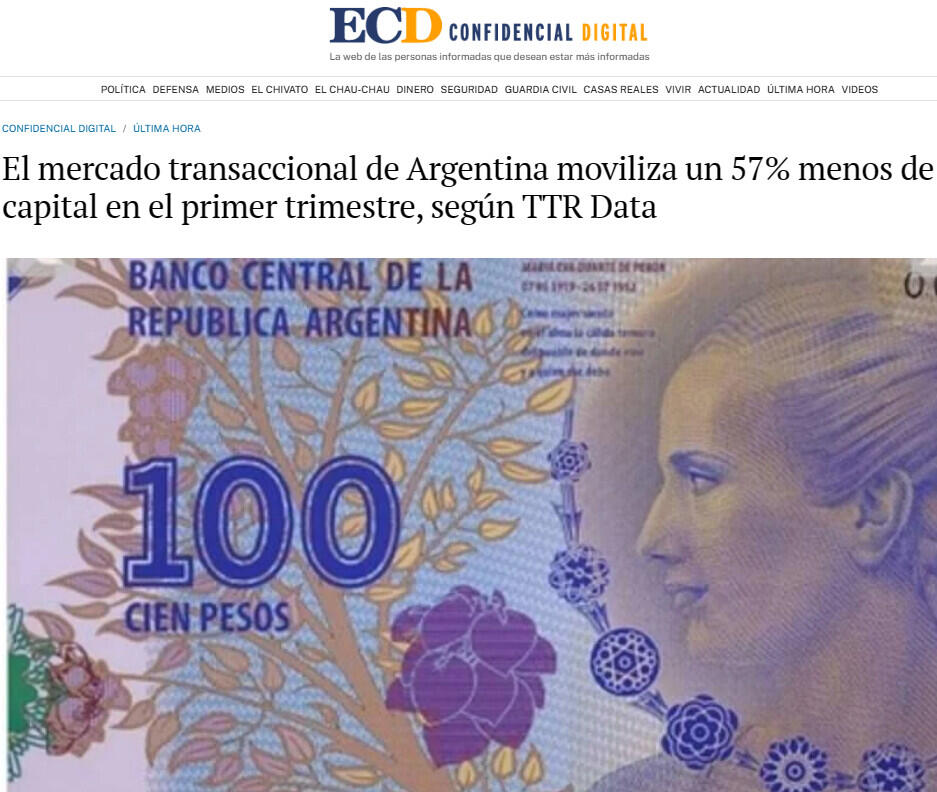 El mercado transaccional de Argentina moviliza un 57% menos de capital en el primer trimestre, según TTR Data