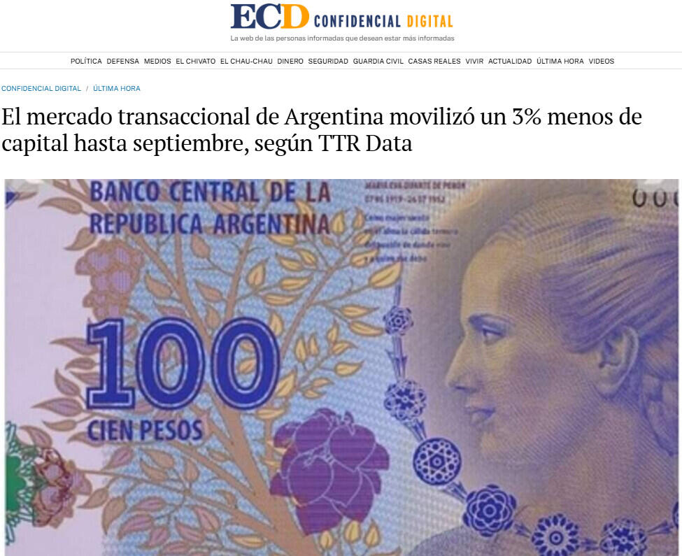 El mercado transaccional de Argentina movilizó un 3% menos de capital hasta septiembre, según TTR Data