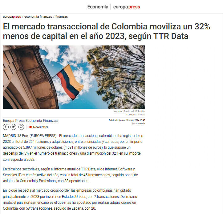 El mercado transaccional de Colombia moviliza un 32% menos de capital en el año 2023, según TTR Data