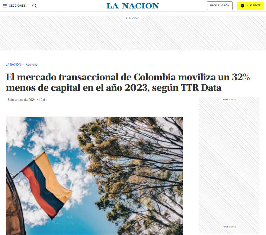 El mercado transaccional de Colombia moviliza un 32% menos de capital en el año 2023, según TTR Data