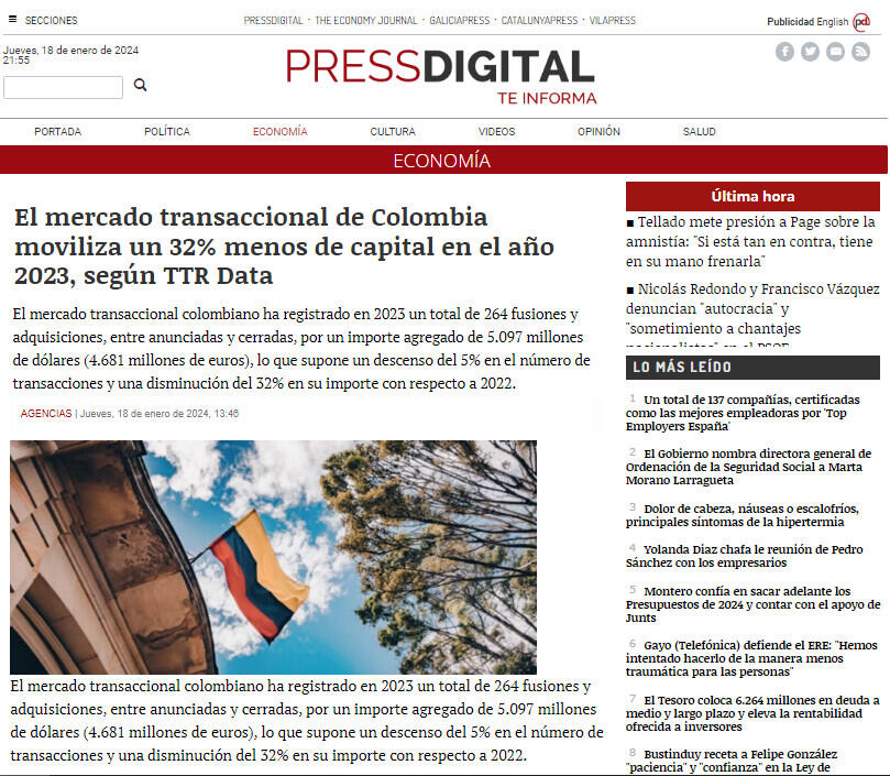 El mercado transaccional de Colombia moviliza un 32% menos de capital en el año 2023, según TTR Data