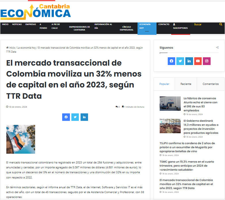 El mercado transaccional de Colombia moviliza un 32% menos de capital en el año 2023, según TTR Data