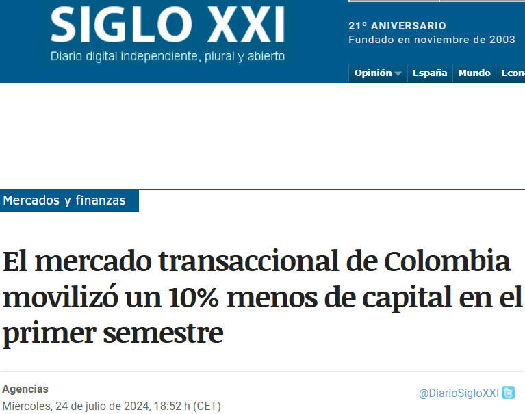 El mercado transaccional de Colombia movilizó un 10% menos de capital en el primer semestre
