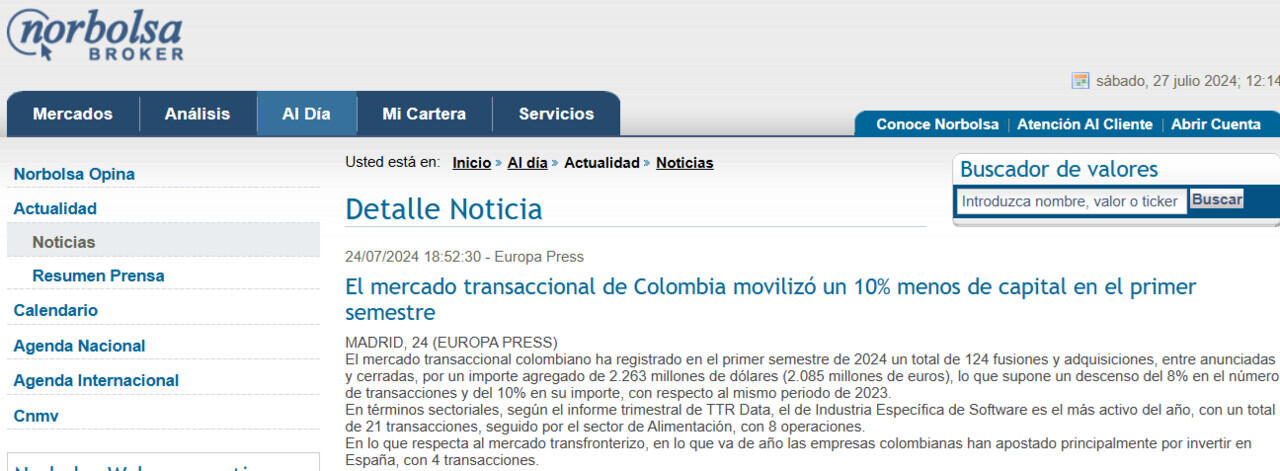 El mercado transaccional colombiano ha registrado en el primer semestre de 2024 un total de 124 fusiones y adquisiciones, entre anunciadas y cerradas, por un importe agregado de 2.263 millones de dólares (2.085 millones de euros), lo que supone un descenso del 8% en el número de transacciones y del 10% en su importe, con respecto al mismo periodo de 2023.
