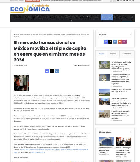 Por lo que respecta al mercado transfronterizo, en el primer mes de 2025 las empresas mexicanas han apostado principalmente por invertir en Chile, con una transacción valorada en 1 millón de dólares (960.000 de euros).