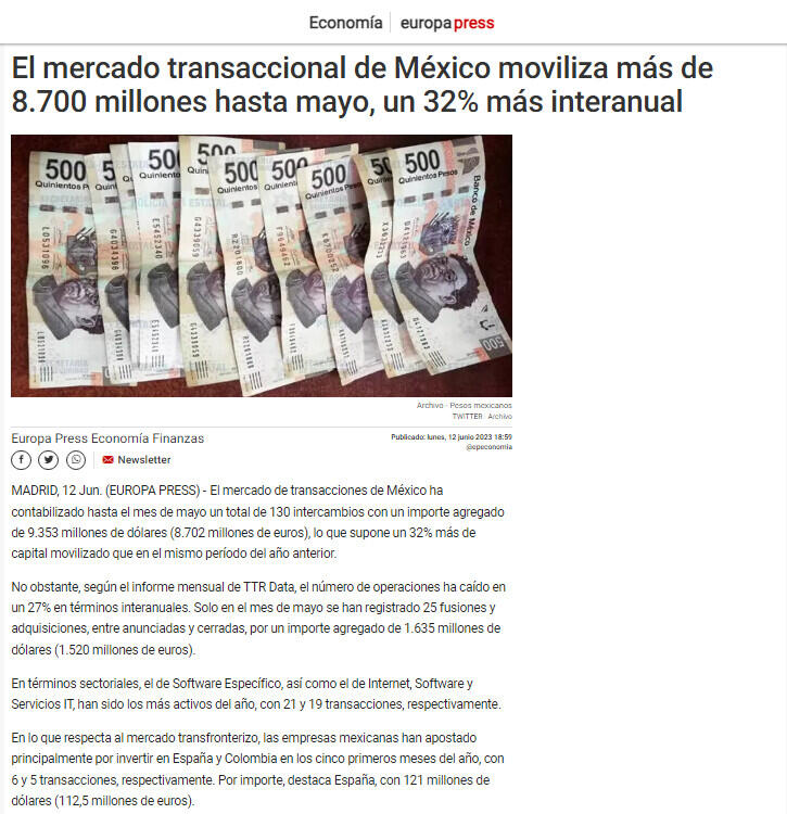 MADRID, 12 Jun. (EUROPA PRESS) - El mercado de transacciones de México ha contabilizado hasta el mes de mayo un total de 130 intercambios con un importe agregado de 9.353 millones de dólares (8.702 millones de euros), lo que supone un 32% más de capital movilizado que en el mismo período del año anterior.
