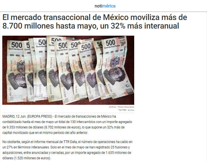 MADRID, 12 Jun. (EUROPA PRESS) - El mercado de transacciones de México ha contabilizado hasta el mes de mayo un total de 130 intercambios con un importe agregado de 9.353 millones de dólares (8.702 millones de euros), lo que supone un 32% más de capital movilizado que en el mismo período del año anterior.