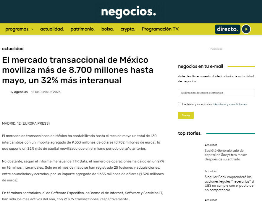 El mercado transaccional de México moviliza más de 8.700 millones hasta mayo, un 32% más interanual