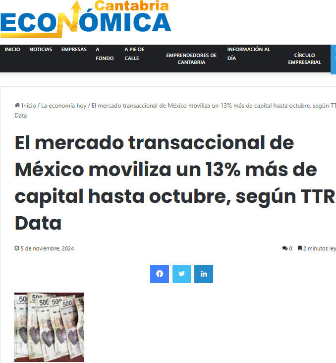 El mercado transaccional de México moviliza un 13% más de capital hasta octubre, según TTR Data