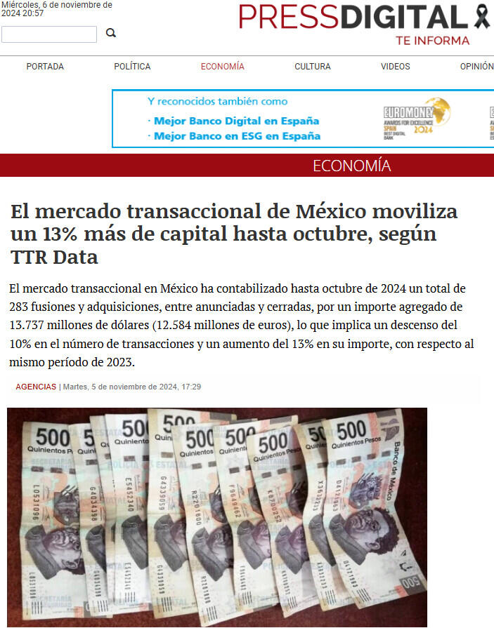 El mercado transaccional en México ha contabilizado hasta octubre de 2024 un total de 283 fusiones y adquisiciones, entre anunciadas y cerradas, por un importe agregado de 13.737 millones de dólares (12.584 millones de euros), lo que implica un descenso del 10% en el número de transacciones y un aumento del 13% en su importe, con respecto al mismo período de 2023.