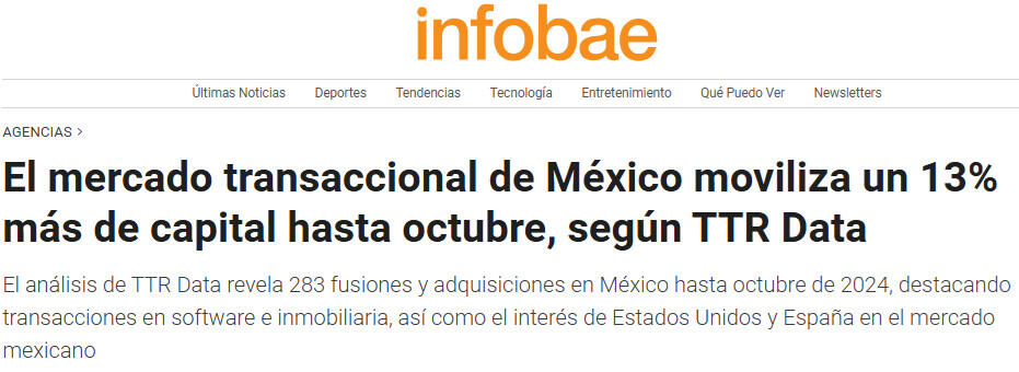 El análisis de TTR Data revela 283 fusiones y adquisiciones en México hasta octubre de 2024, destacando transacciones en software e inmobiliaria, así como el interés de Estados Unidos y España en el mercado mexicano