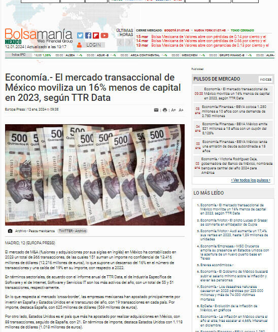 El mercado transaccional de México moviliza un 16% menos de capital en 2023, según TTR Data