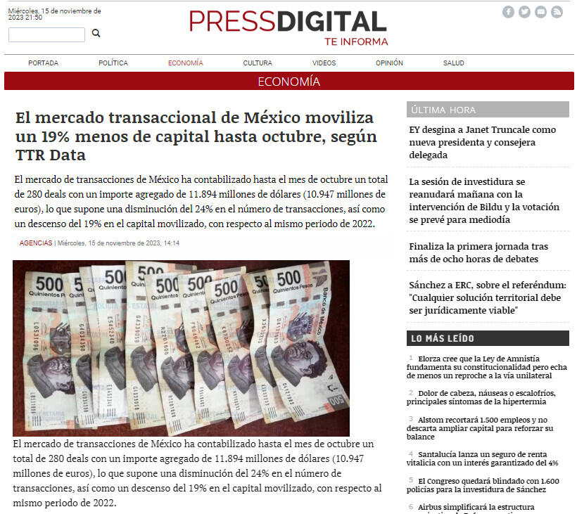 El mercado transaccional de México moviliza un 19% menos de capital hasta octubre, según TTR Data