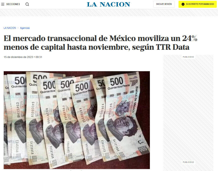 El mercado transaccional de México moviliza un 24% menos de capital hasta noviembre, según TTR Data
