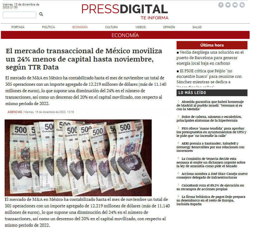 El mercado transaccional de México moviliza un 24% menos de capital hasta noviembre, según TTR Data