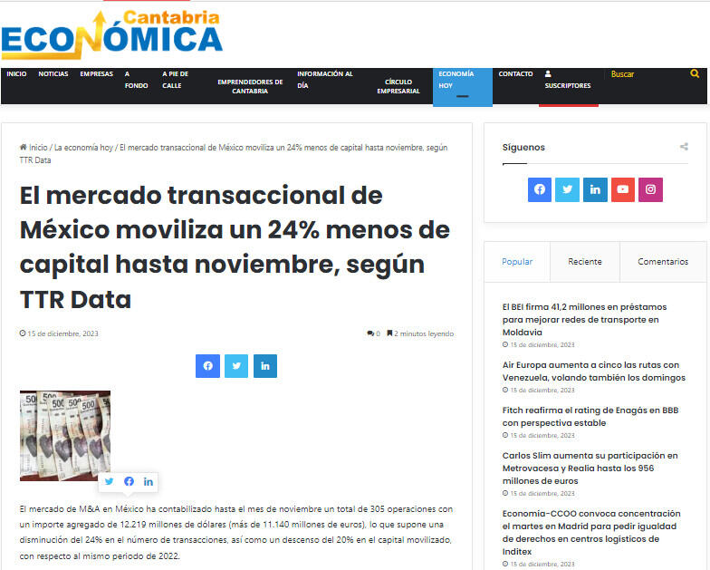 Por su parte, según el informe mensual de TTR Data, en el mes de noviembre, se han registrado 19 fusiones y adquisiciones, entre anunciadas y cerradas, por un importe agregado de 265 millones de dólares (242 millones de euros).