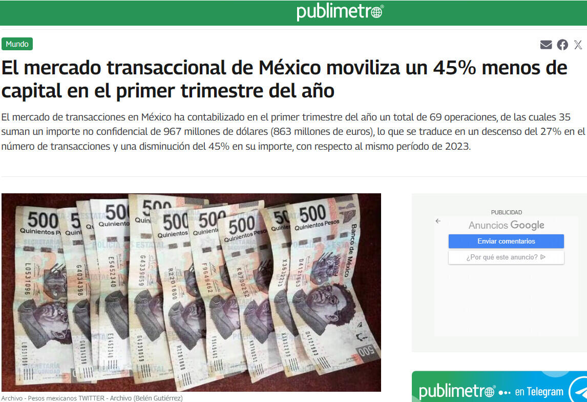 El mercado de transacciones en México ha contabilizado en el primer trimestre del año un total de 69 operaciones, de las cuales 35 suman un importe no confidencial de 967 millones de dólares (863 millones de euros), lo que se traduce en un descenso del 27% en el número de transacciones y una disminución del 45% en su importe, con respecto al mismo período de 2023.