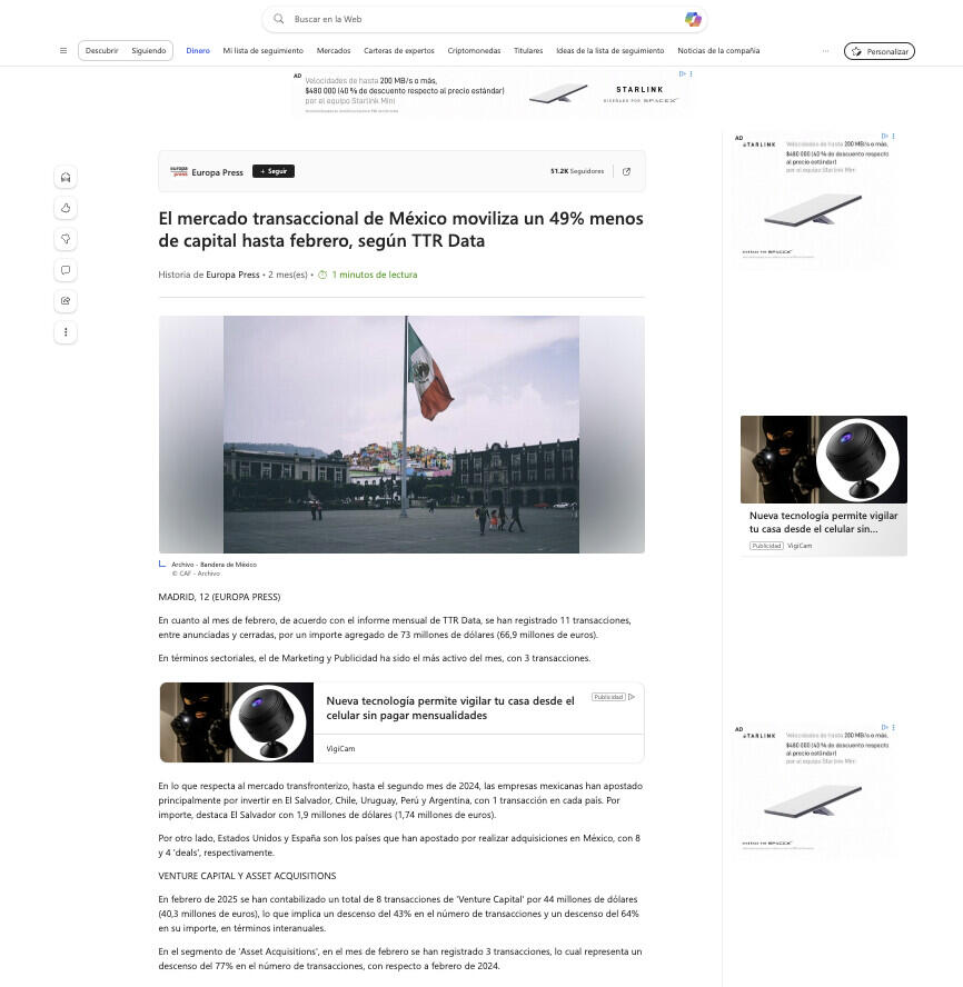 En febrero de 2025 se han contabilizado un total de 8 transacciones de 'Venture Capital' por 44 millones de dólares (40,3 millones de euros), lo que implica un descenso del 43% en el número de transacciones y un descenso del 64% en su importe, en términos interanuales.
