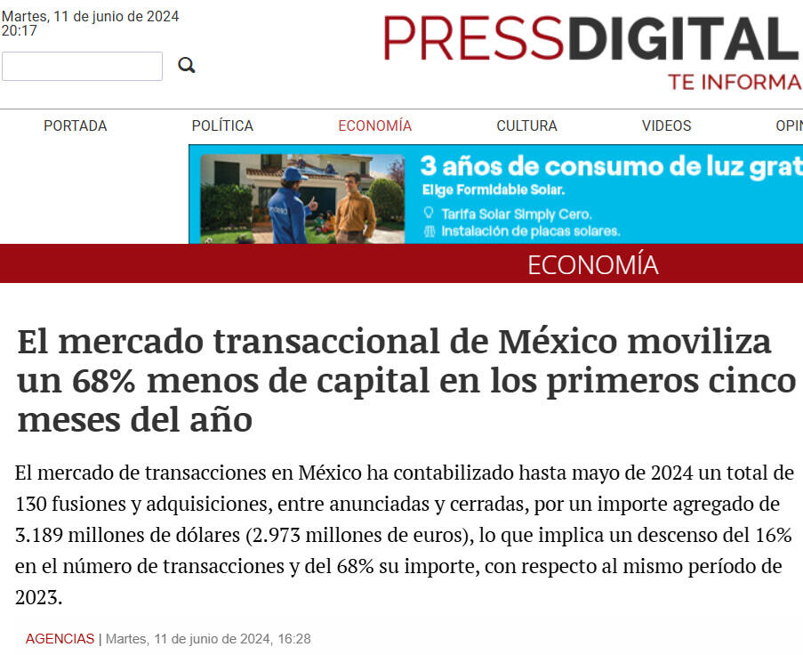 En lo que respecta al mercado transfronterizo, hasta el quinto mes de 2024, las empresas mexicanas han apostado principalmente por invertir en España y Colombia, con 9 transacciones en cada país. Por importe, destaca España, con 361 millones de dólares (336 millones de euros).