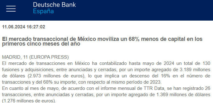 El mercado de transacciones en México ha contabilizado hasta mayo de 2024 un total de 130 fusiones y adquisiciones, entre anunciadas y cerradas, por un importe agregado de 3.189 millones de dólares (2.973 millones de euros), lo que implica un descenso del 16% en el número de transacciones y del 68% su importe, con respecto al mismo período de 2023.