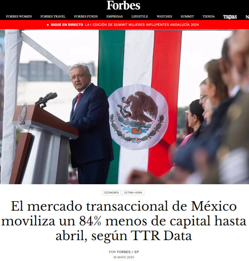 El mercado transaccional de México moviliza un 84% menos de capital hasta abril, según TTR Data
