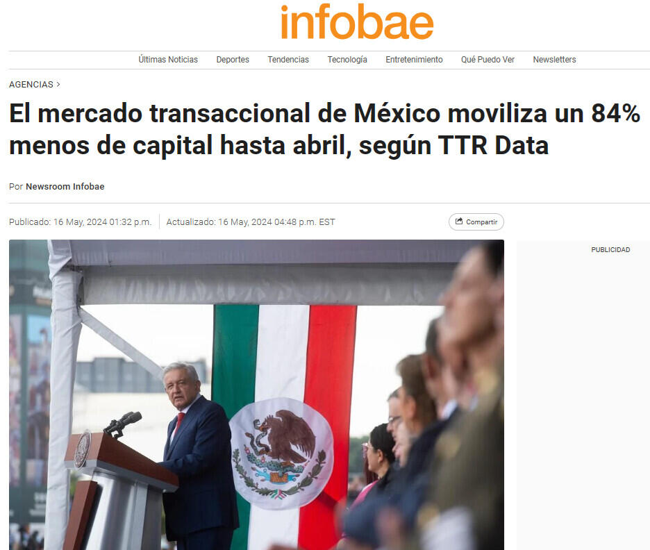El mercado transaccional de México moviliza un 84% menos de capital hasta abril, según TTR Data