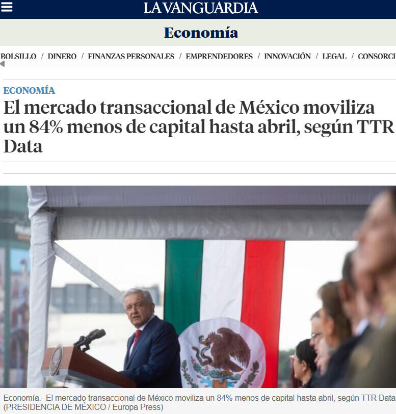 El mercado transaccional de México moviliza un 84% menos de capital hasta abril, según TTR Data