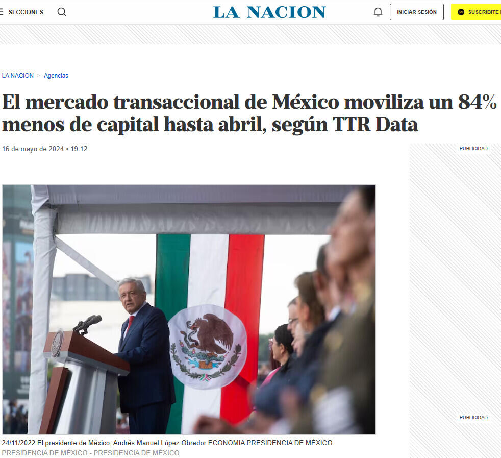El mercado transaccional de México moviliza un 84% menos de capital hasta abril, según TTR Data