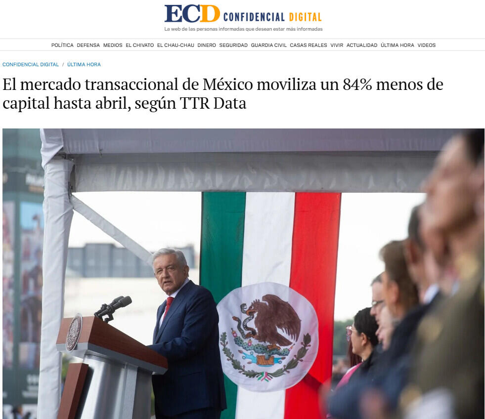 El mercado transaccional de México moviliza un 84% menos de capital hasta abril, según TTR Data