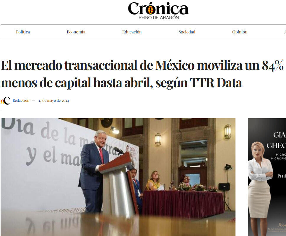 El mercado transaccional de México moviliza un 84% menos de capital hasta abril, según TTR Data