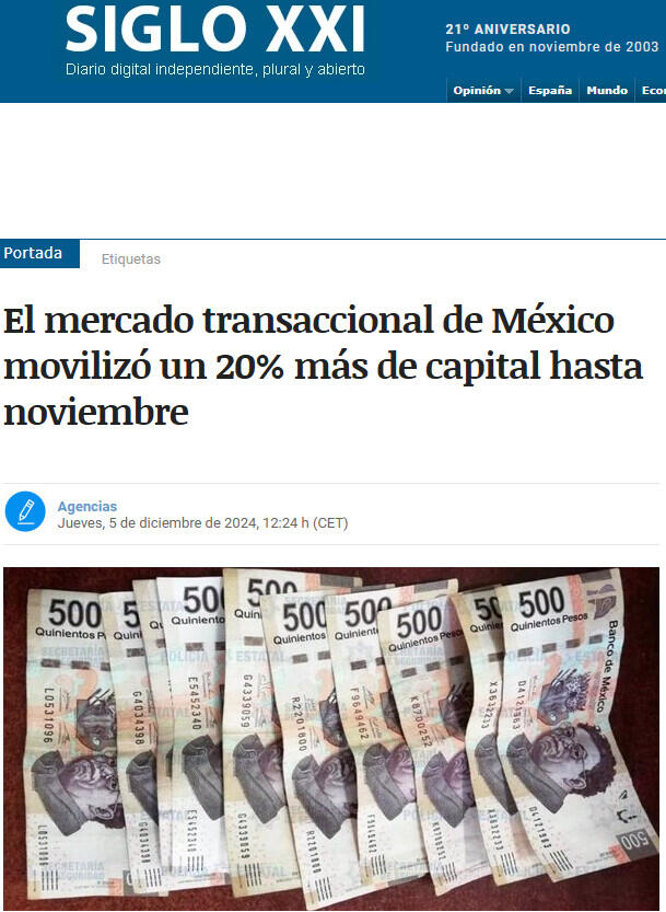 El mercado transaccional en México ha contabilizado un total de 307 fusiones y adquisiciones hasta noviembre de 2024, entre anunciadas y cerradas, por un importe agregado de 15.146 millones de dólares (14.387 millones de euros), lo que implica un descenso del 9% en el número de transacciones y un aumento del 20% en su importe, con respecto al mismo período de 2023.