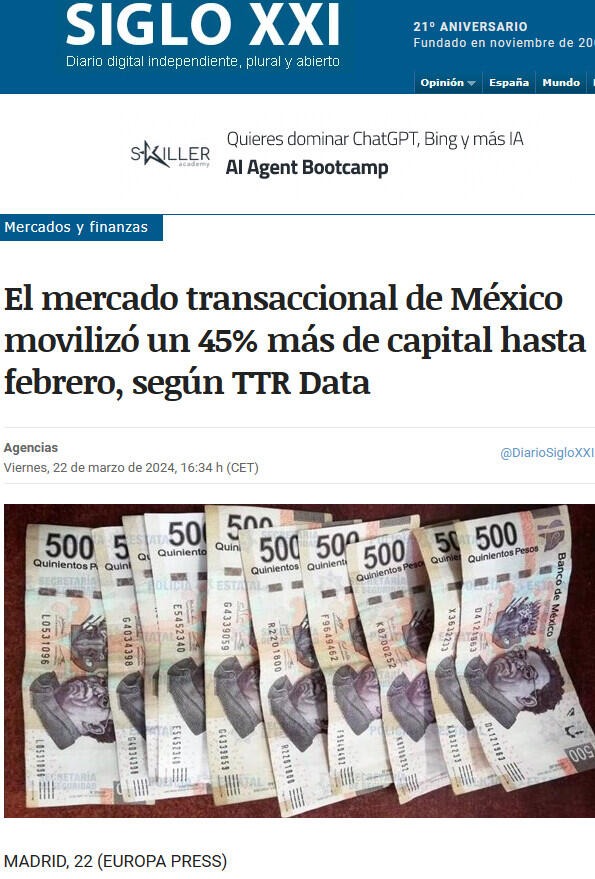 El mercado transaccional de México movilizó un 45% más de capital hasta febrero, según TTR Data